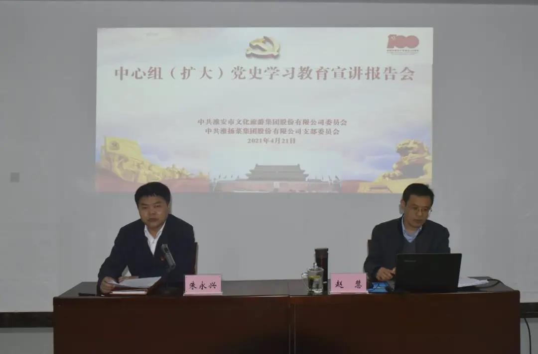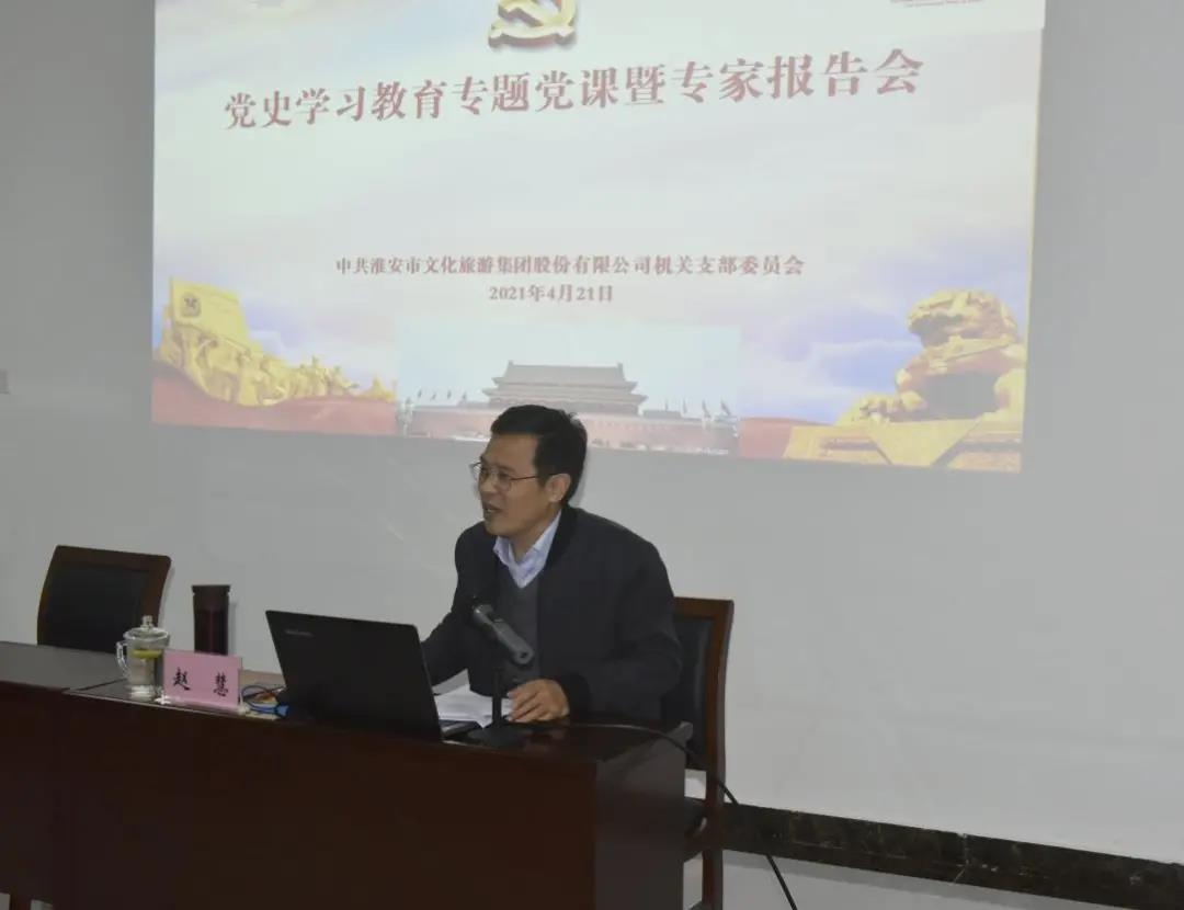 4月21日,市文旅集团、淮扬菜集团组织召开党史学习教育宣讲报告会,邀请党史学习教育淮安市委宣讲团成员、江苏食品药品职业技术学院马克思主义学院院长、书记、教授赵慧为大家作《苦难奋进铸就百年辉煌》党史学习教育专题辅导讲座。报告会由文旅集团党委书记、董事长、总经理朱永兴主持。