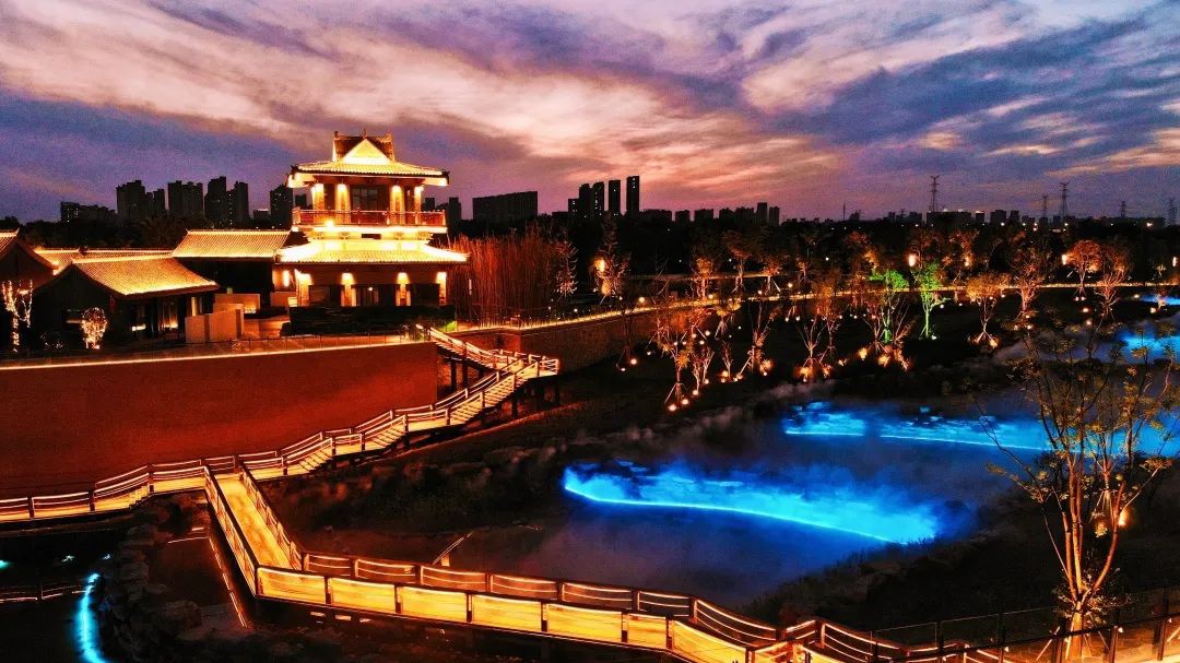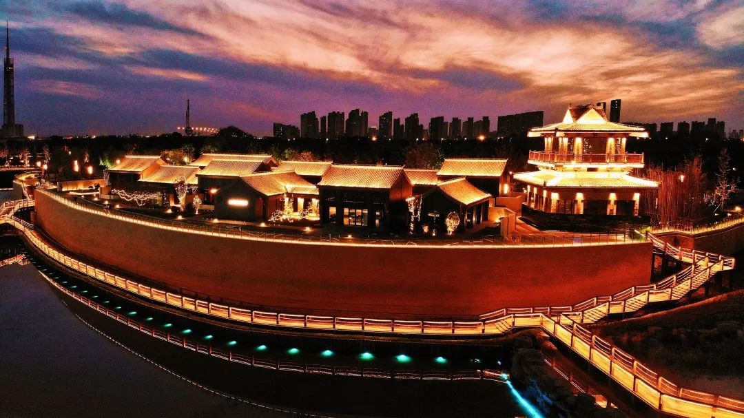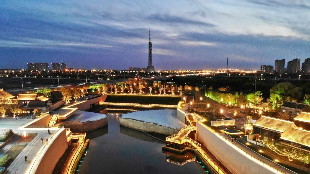 10月27日傍晚,大运河板闸遗址公园美轮美奂。公园占地109亩,于2020年10月开工建设,目前建筑及市政景观全部完成,室外部分已对外开放,展示馆其它区域施工正有序推进。