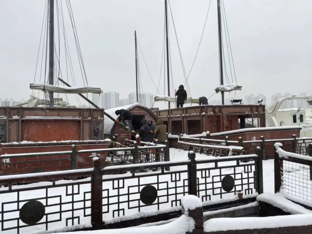 在里运河文化长廊清江浦景区、白马湖旅游度假区、板闸遗址公园、清江浦广场·漕运门、淮安老船厂、淮扬菜文化博物馆、新华印刷厂、清元停车场等处,各部门、子公司全员出动、不舍昼夜,大家拿起铁锨、扫把等工具,分工明确,配合默契,冒着寒风,清理着地面上的积雪以及冰封的路面。虽然天气寒冷,冰冻形成的积冰清理难度大,但集团干部职工们热情高涨、干劲十足,经过连续、有序的除雪铲冰作业,各景区冰冻所带来的安全隐患大大降低。