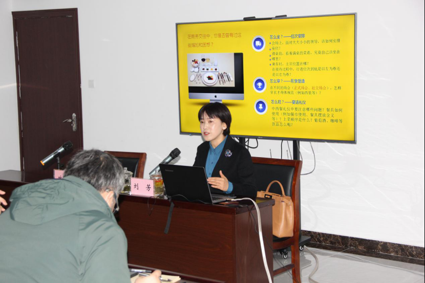 培训特邀淮阴师范学院外国语学院副书记、副院长刘芳同志授课。刘教授从礼仪概述、职业形象、职场礼数、会议仪式、商务宴请等五个方面进行了深入细致的阐述,让参训人员对办公礼仪和商务交往中接待礼仪等方面有了深刻全面的认识。